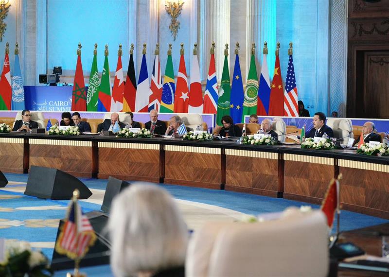 وشدد، خلال لقائه يلتقي في القاهرة الأمين العام للأمم المتحدة وأمين عام الاتحاد الأوربي والعاهل الأردني ورئيس الوزراء الأسباني، على "إيقاف الحرب وفتح ممرات آمنة لإيصال المساعدات لقطاع غزة".