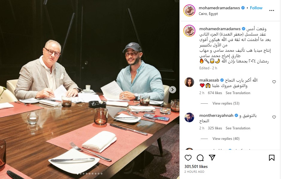 وعلق محمد رمضان على الصور قائلا "و قعت أمس عقد مسلسل (جعفر العمدة) الجزء الثاني بعد ما أطمنت انه ثقة في الله هيكون أقوى من الأول بكتير، إنتاج ميديا هب تأليف محمد سامي و مهاب طارق إخراج محمد سامي، رمضان 2024 يجمعنا بإذن الله".