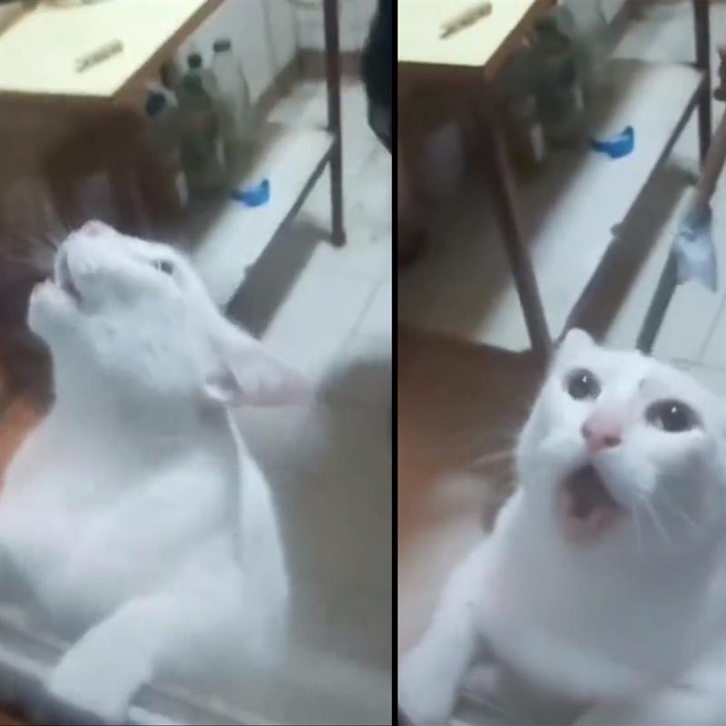 تداول رواد موقع تويتر، مقطع فيديو يظهر فيه رجل يمسك بمقشة، داخل المطبخ، ومعه قط، وبعد ثوان يظهر جرذ، يجري على الأرض، فزع القط وألصق مخالبه في باب المطبخ عاليا.