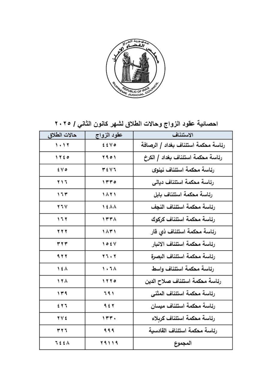 نشر مجلس القضاء الأعلى، اليوم الخميس، إحصائية لحالات الزواج والطلاق المسجلة في المحاكم المدنية في العراق لشهر كانون الثاني/ يناير من العام 2025، حيث تصدرت العاصمة بغداد، ومحافظة نينوى، ومحافظة البصرة معدلات عقود الزواج وحالات الطلاق.