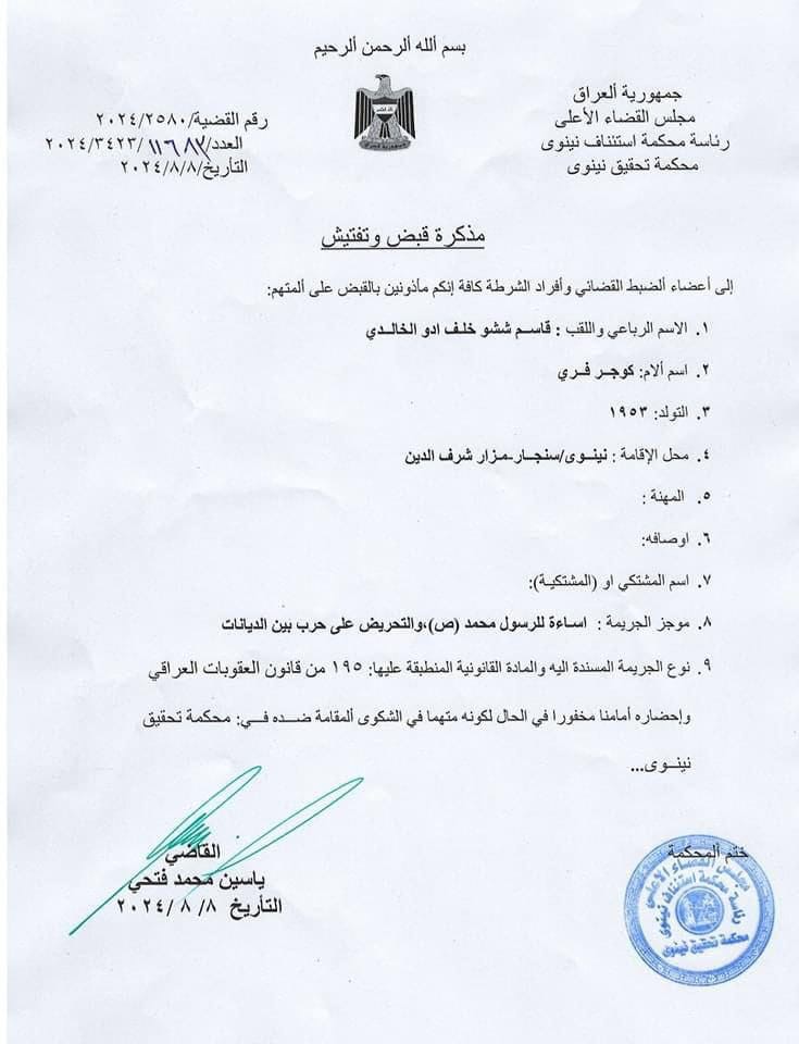أصدرت رئاسة محكمة استئناف نينوى، اليوم الخميس، امرا بالقاء القبض على المدعو "قاسم ششو” بعد اساءته للرسول (ص).