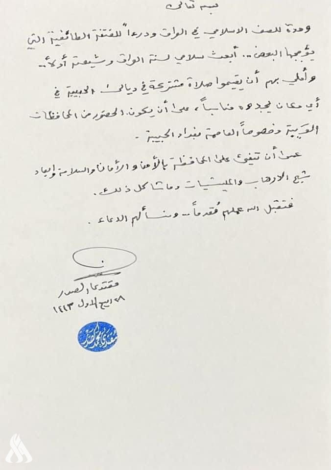 الصدري مقتدى الصدر، الأربعاء، إلى صلاة موحدة بين السنة والشيعة في ديالى لدرء الفتنة