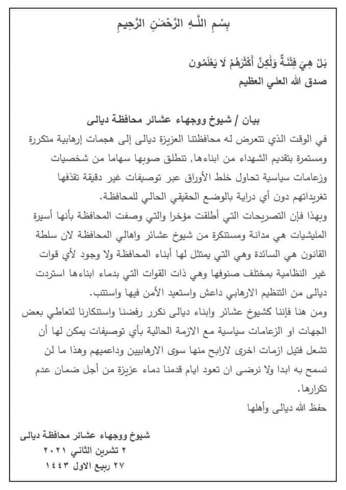 الى ذلك قال شيوخ ووجهاء عشائر محافظة ديالى انه