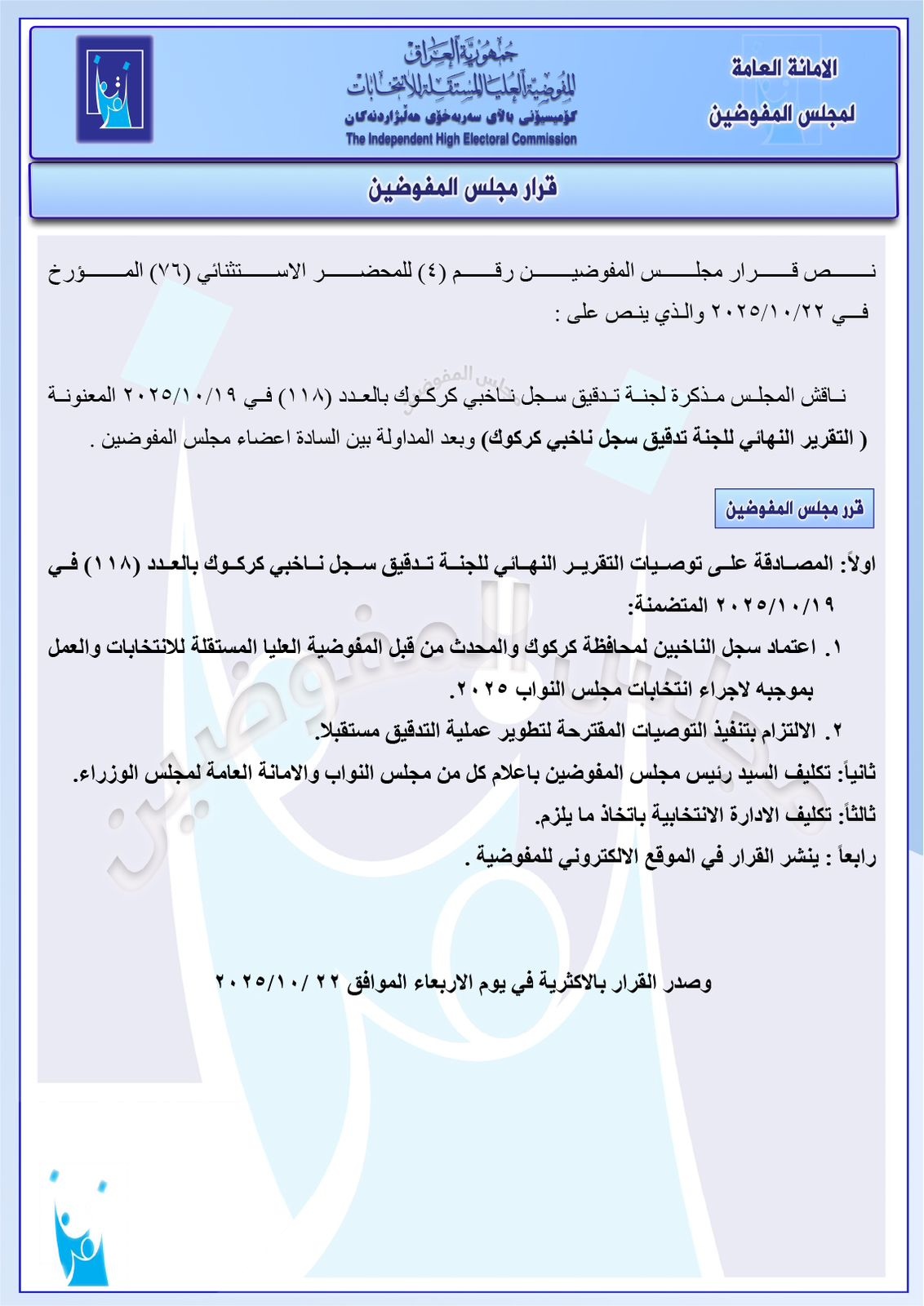 دهستهی كۆمسیارانی كۆمسیۆنی ههڵبژاردنهكانی عێراق، راسپاردهكانی راپۆرتی كۆتایی لیژنهی وردبینی تۆماری دهنگدهرانی كهركوكی پهسهند كرد و بڕیاریدا بۆ پرۆسهی ههڵبژاردن، پشت بهتۆماری نوێی دهنگدهران ببهسترێت.