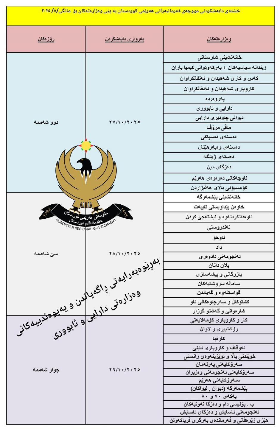 بە گوێرەی راگەیەندراوەکە، سبەینێ وەزارەتەکانی (خانەنشینی شارستانی، خاوەن پێداویستییەکان، زیندانییە سیاسییەکان و بەرکەوتووانی کیمیاباران، کەس و کاری شەهیدان و ئەنفالکراوان، پەروەردە، خانەنشینی پێشمەرگە، دارایی و ئابوری ، دەستەی دەستپاکی، دەستەی وەبەرهێنان، دەستەی ژینگە، دەزگای مین، ناوچەکانی دەرەوەی هەرێم، کۆمسیۆنی باڵای هەڵبژاردن، دیوانی چاودێری دارایی، مافی مرۆڤ) مووچەی مانگی حەوت وەربگرن.