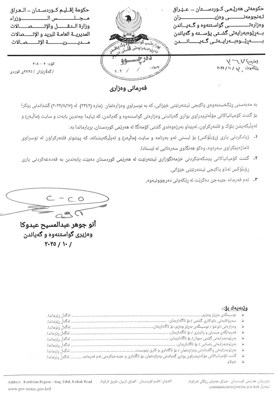 ئینتەرنێتی لە هەرێمی کوردستان ئاگادار کردەوە کە پێویستە پابەندبن بە قەدەغەکردنی