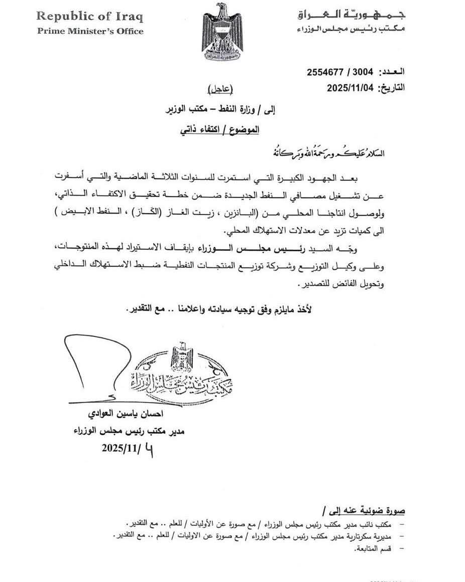ئەمڕۆ سێشەممە ٤ـی ١١ـی ٢٠٢٥، بە گوێرەی نووسراوێکی فەرمی محەمەد شیاع سودانی، سەرۆک وەزیرانی عێراق فەرمانی وەستاندنی هاوردەکردنی بەنزین، نەوت و عازی دەرکرد و بۆ لەمەودوا پشت بە بەرهەمهێنانی ناوخۆ دەبەستن بۆ پڕکردنەوەی پێداویستییەکان.