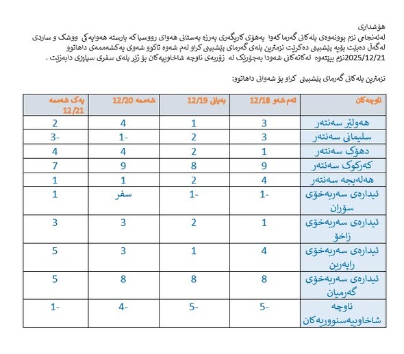 ئەمڕۆ چوارشەممە ١٧ـی کانونی یەکەمی ٢٠٢٥، كهشناسی ههرێم له راگهیهندراوێكدا بڵاویکردەوە، "له ئهنجامی نزمبوونهوهی پلهگانی گهرما بههۆی كاریگهری بهرزهپهستانی ههوای روسیا كه بارسته ههوایهكی وشك و ساردی لهگهڵ دهبێت، پێشبینی نزمبوونهوهی پلهكانی گهرما دهكرێت.