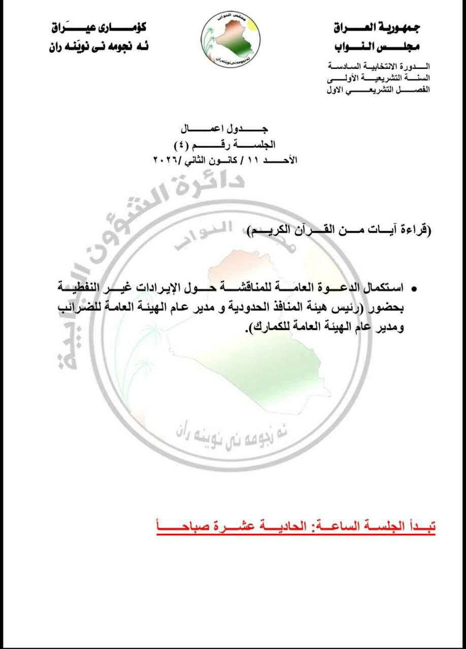 ئەمڕۆ شەممە ١٠ـی کانونی دووەمـی ٢٠٢٦، بەگوێرەی کارنامەی فەرمیی پەرلەمانی عێراق، دانیشتنەکە کاتژمێر ١١ـی بەیانی دەستپێدەکات، بڕگەی سەرەکی کۆبوونەوەکە تەرخانکراوە بۆ تەواوکردنی گفتوگۆ گشتییەکان دەربارەی سەرچاوەکانی داهاتی نانەوتی لە عێراق.