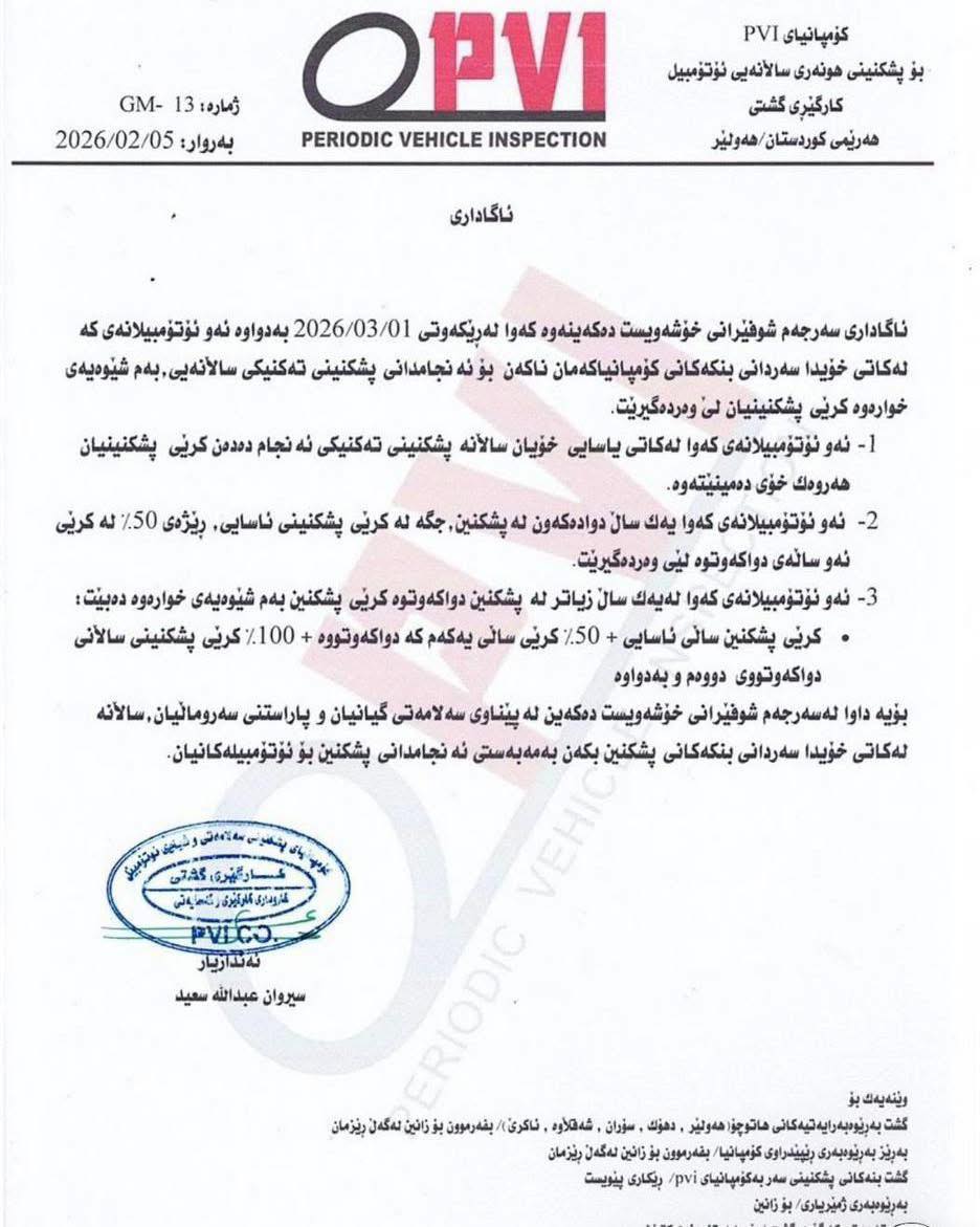 ئەمڕۆ یەکشەممە ٨ـی شوباتی ٢٠٢٦، بهگوێرهی نوسراوێكی فهرمی كۆمپانیای PVI بۆ پشكنینی ههززهی ساڵانه، لەمرۆوە رێنماییهكان دهخرێنهبواری جێبهجێكردنهوه و سیستمی كرێی پشكنینی ساڵانه و سزای دواكهوتن بهگوێرهی كۆتا پشكنین كه بۆ ئۆتۆمبێلهكه ئهنجامدرابێت جێبهجێدهكرێت.