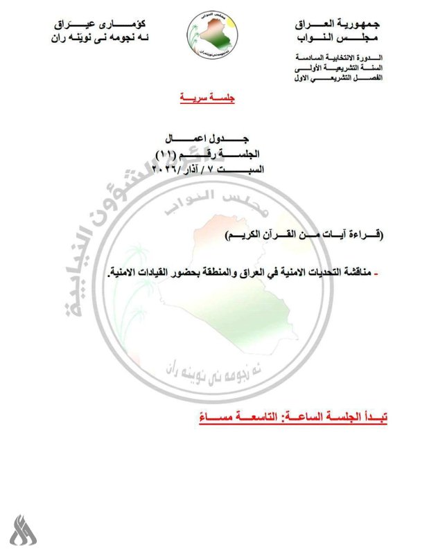 بڕیارە ڕۆژی شەممە، پەرلەمانی عێراق کۆبوونەوەیەکی تایبەت ئەنجام بدات و بەپێی کارنامەکە، تەوەرەی سەرەکیی دانیشتنەکە بۆ گفتوگۆکردنە لەبارەی ئاڵنگارییە ئەمنییەکانی عێراق و ناوچەکە، کە تێیدا فەرماندە باڵا ئەمنییەکان ئامادە دەبن.