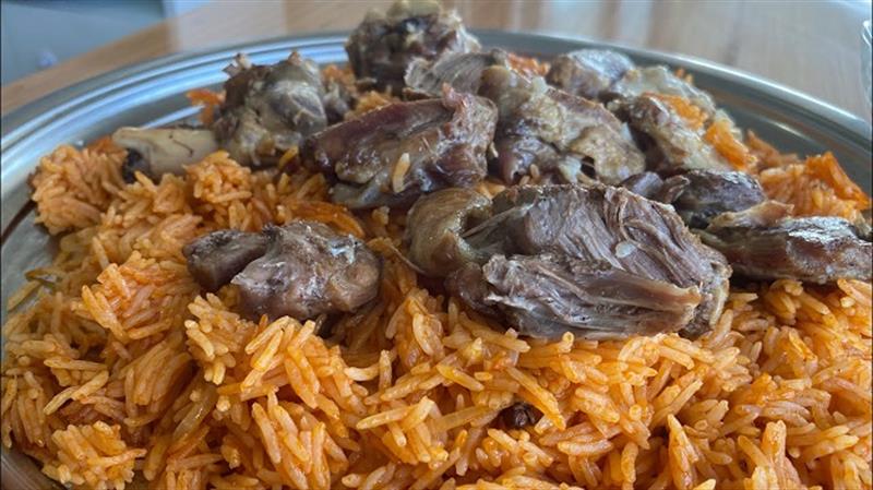 برنجەکە، گۆشتەکە بکەرەوە سەری، بادام و کشمیشەکەش لە زەیتدا کەمێک ئاڵیبکە، بیکەرەوە