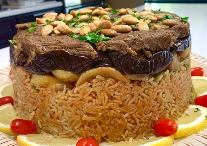 برنجەکە، گۆشتەکە بکەرەوە سەری، بادام و کشمیشەکەش لە زەیتدا کەمێک ئاڵیبکە، بیکەرەوە