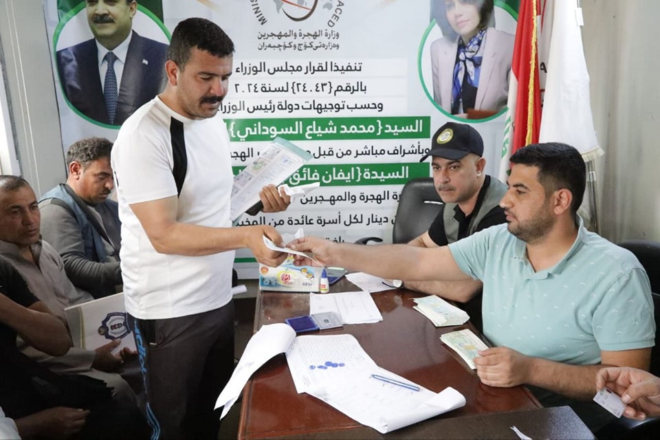 وأضافت، أنه "بناء على توجيهات الوزيرة، قامت كوادر الوزارة بتسليم (صكوك) المنحة المالية البالغة أربعة ملايين دينار للنازحين داخل المخيم، إضافة إلى السلع المعمرة (شاشة بلازما، طباخ، ثلاجة) والمواد الإغاثية على الأسر العائدة".