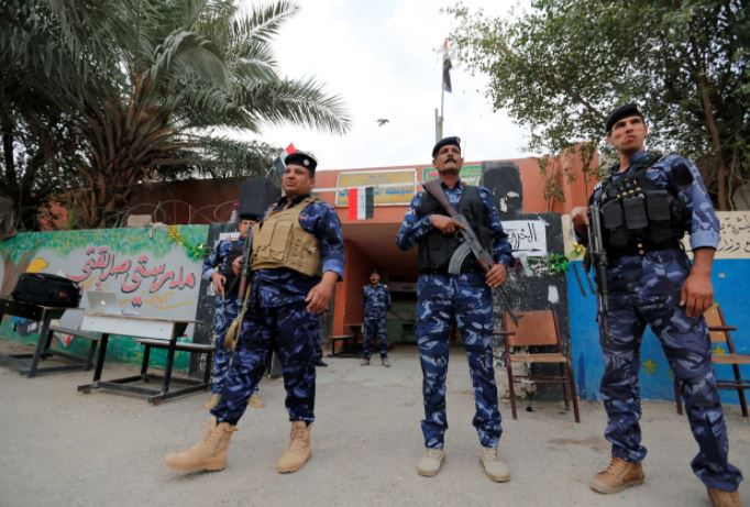 Security forces stand guard outside a polling station during the parliamentary election in Baghdad, May 12, 2018.REUTERS/Wissm al-Okili