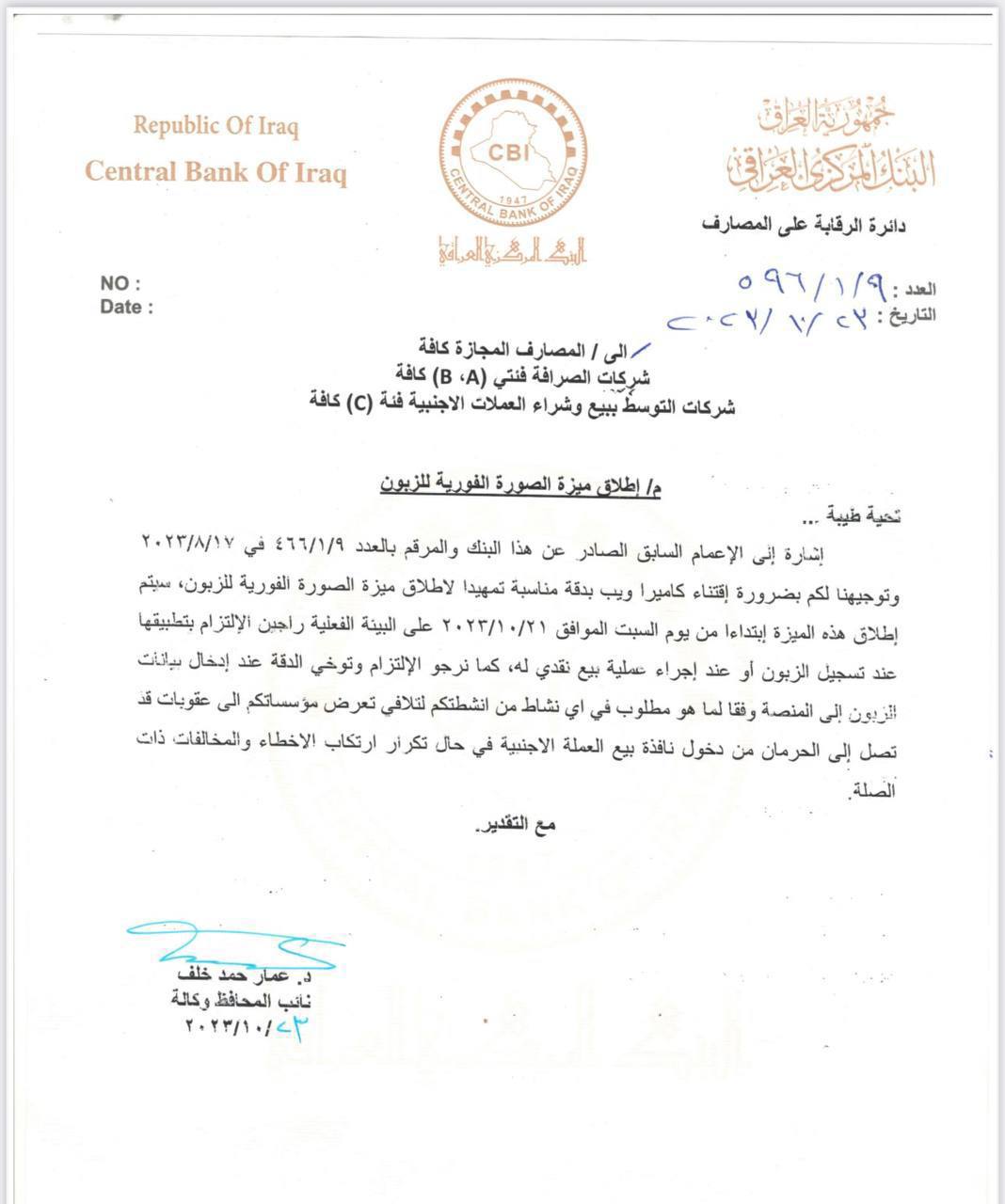 وحصل NRT عربية، على وثيقة صادرة من البنك المركزي العراقي بتاريخ اليوم، موجهة إلى المصارف المجازة وشركات التوسط ببيع وشراء العملات الاجنبية، تضمنت توجيها بإقتناء كاميرا ويب بدقة عالية من اجل إطلاق ميزة الصورة الفورية للزبون.