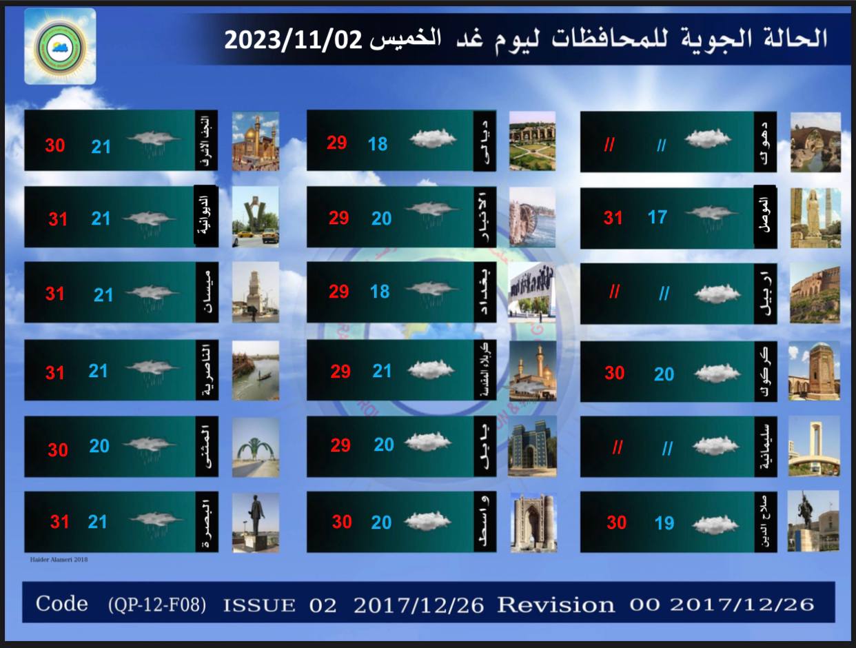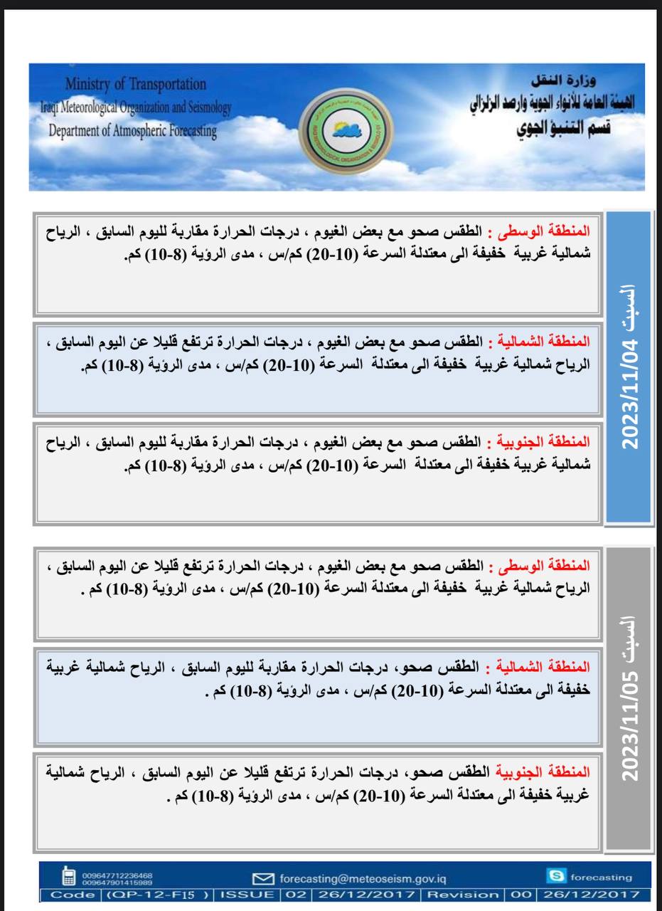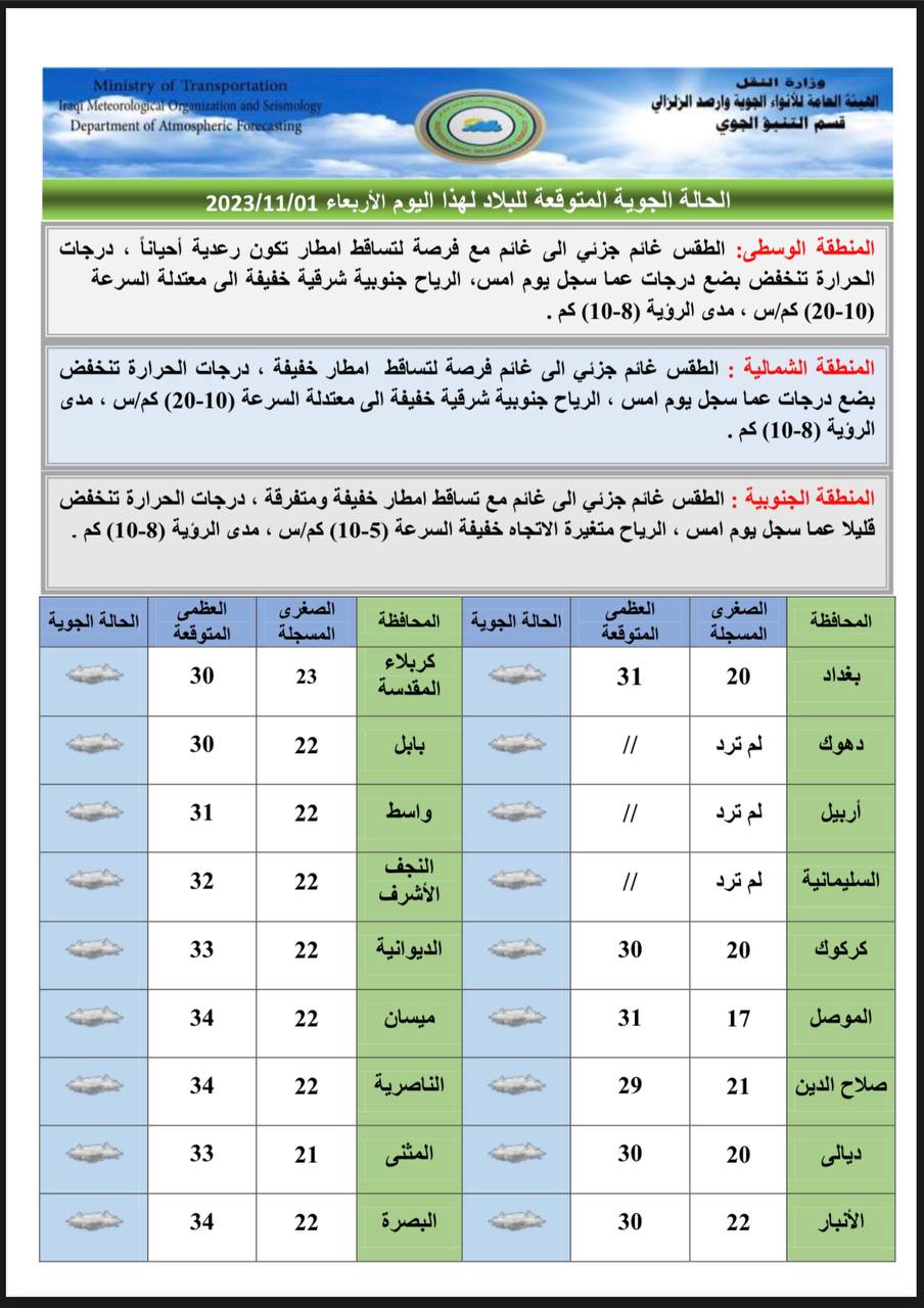 أعلنت هيئة الأنواء الجوية، اليوم الأربعاء، عن حالة الطقس في البلاد للأيام المقبلة، فيما توقعت تساقطا للأمطار وارتفاعا جديدا في درجات الحرارة.