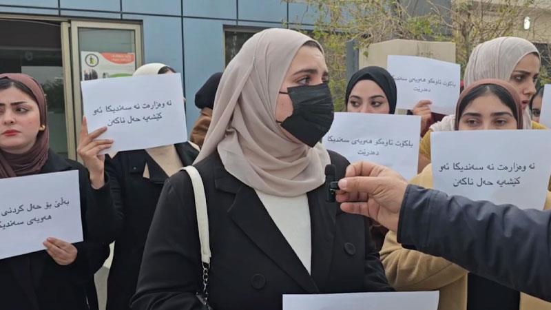 دەرچووانی پەیمانگای پیرمامی ئەهلی لەبەردەم وەزارەتی خوێندنی باڵا گردبوونەوە و دەڵێن، سەندیکا باجیان بۆ ناکەن تا بتوانن کاری پێبکەن.