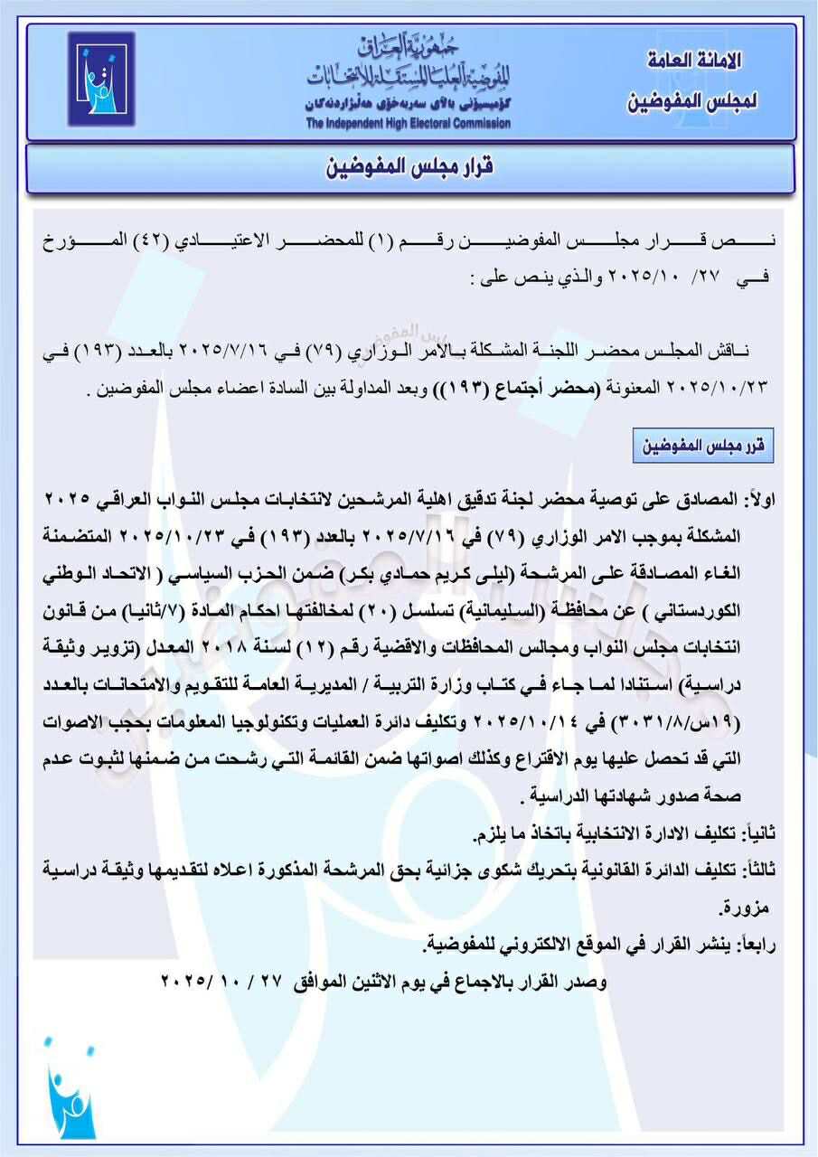 ئەنجومەنی كۆمسیارانی سەر بە كۆمسیۆنی باڵای هەڵبژاردنەكانی عێراق بە فەرمی بڕیاری دوورخستنەوەی کاندیدێکی یەكێتی دەركرد، هۆكارەكەشی بۆ ساختەكاریكردن لە بڕوانامەكەی گەڕاندەوە.