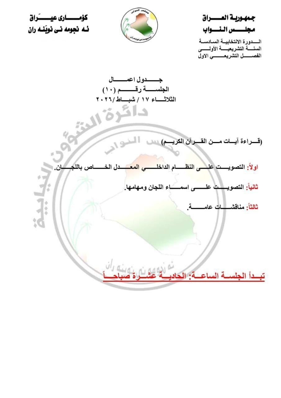 ئەمڕۆ دووشەممە ١٦ـی شوباتی ٢٠٢٦، پەرلەمانی عێراق کارنامەی دانیشتنی سبەی بڵاوکردەوە و جارێكی دیكه تهوهری ههڵبژاردنی سهرۆك كۆماری تێدا نییه.
