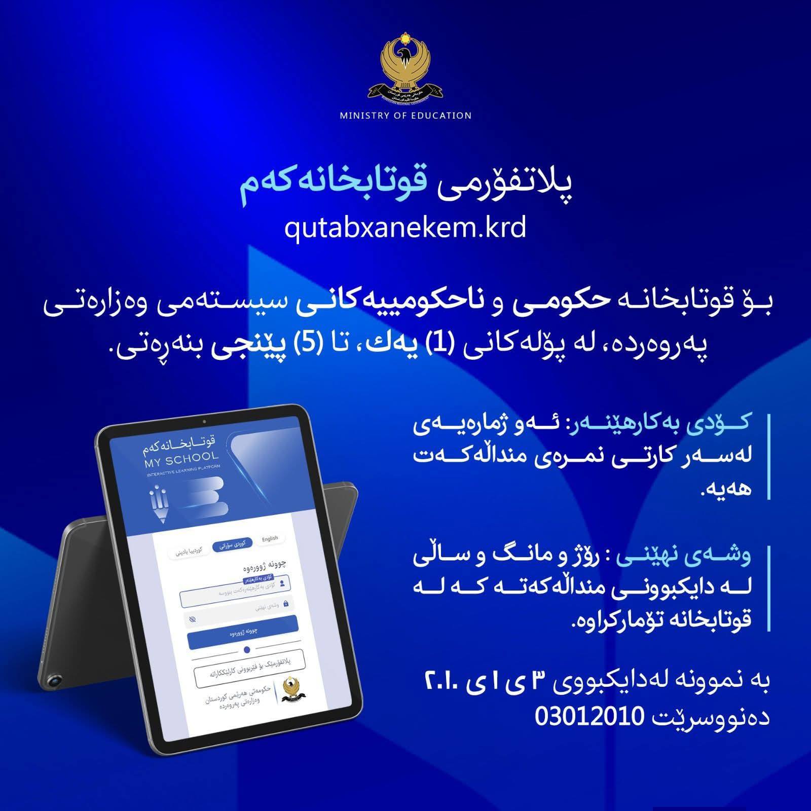 ئەمڕۆ یەکشەممە ٢٩ـی ئازاری ٢٠٢٦، وەزارەتی پەروەردەی هەرێم لە راگەیەندراوێکدا بڵاویکردەوە، قوتابخانە حکومییەکان بەشێوەی خوێندنی ئەلیکترۆنی و دیجیتاڵی دەتوانن سوود لە خزمەتگوزارییەکانی پلاتفۆرمی ( ئی-وانە) و پلاتفۆرمی ( قوتابخانەکەم ) وەربگرن، یان سوود لە گروپە ئەلیکترۆنییەکانی قوتابخانەکان وەردەگرن بۆ پێدانی ئەرکی ماڵەوە لەلایەن مامۆستایان بەشێوەی رۆژانە.